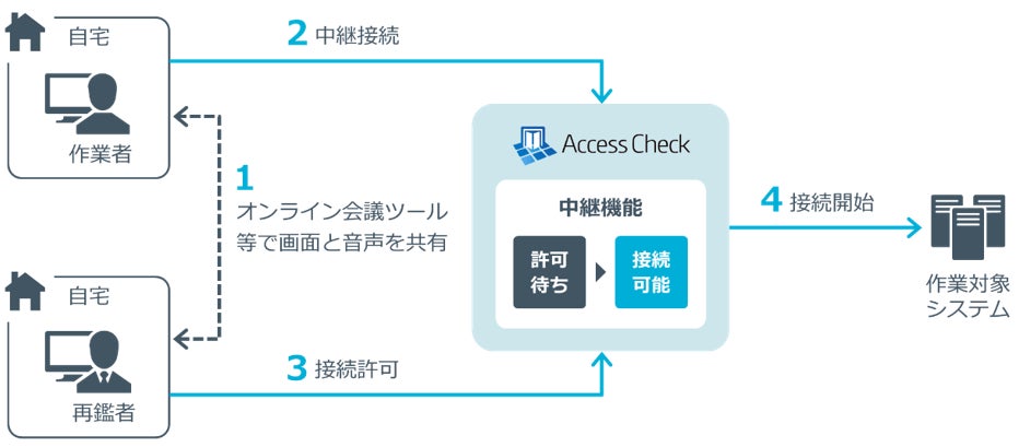 こうした問題を解決するため、本製品に「中継接続許可機能」を新たに追加しました。この機能を利用することで、作業者単独ではシステムへ接続できず、別の担当者(再鑑者)による接続許可をもって作業者は中継接続できるようになります(図1を参照)。作業者が事前にオンライン会議ツールなどで作業画面と音声を共有した後、再鑑者が接続を許可するといった運用を行うことで、テレワーク環境においても二人体制による作業を実現します。