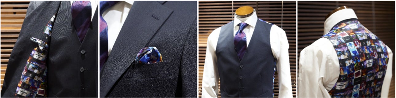 ②胸ポケット裏地に場面写真総柄を使用した、隠しチーフ仕様