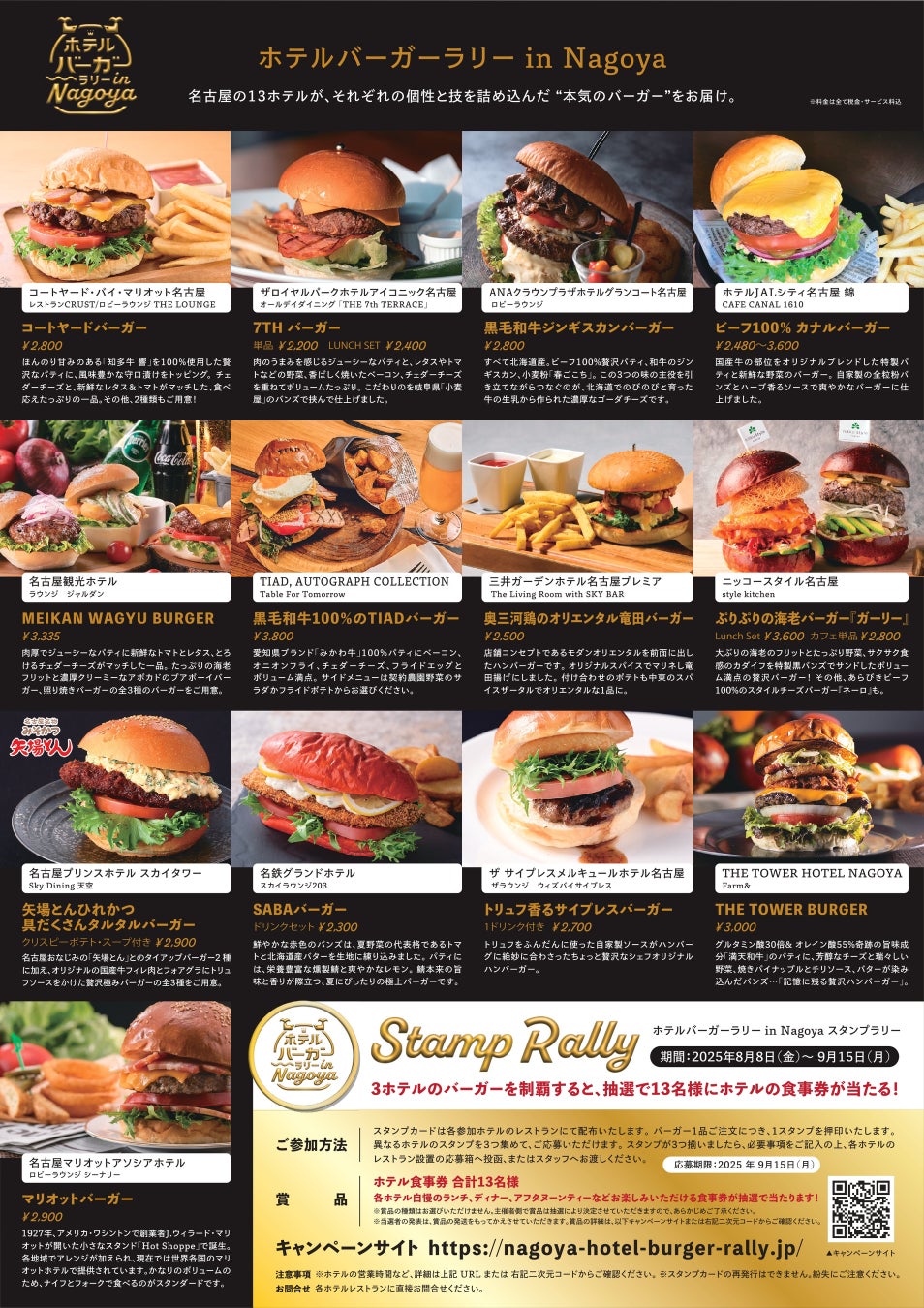 「ホテルバーガーラリー in Nagoya」と題した本共同イベントでは、名古屋の夏を盛り上げるべく市内の13ホテルがそれぞれ趣向を凝らしたこだわりのバーガーを提供いたします。本企画は、気軽にホテルレストランをご利用いただき、お好みのバーガーを楽しみながらホテルの魅力を感じていただける、新たな取り組みとなっております。期間中、3ホテルのバーガーを制覇すると、参加ホテルの食事券が当たるスタンプラリーも実施いたします。