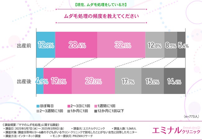 育児により処理頻度が減った現実がある一方、サロンやクリニックでの脱毛施術の需要の高さがうかがえます。