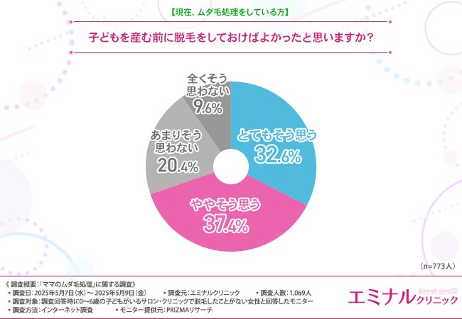 「子どもを産む前に脱毛をしておけばよかったと思いますか?」と質問したところ、約7割の方が『とてもそう思う(32.6%)』『ややそう思う(37.4%)』と回答しました。
