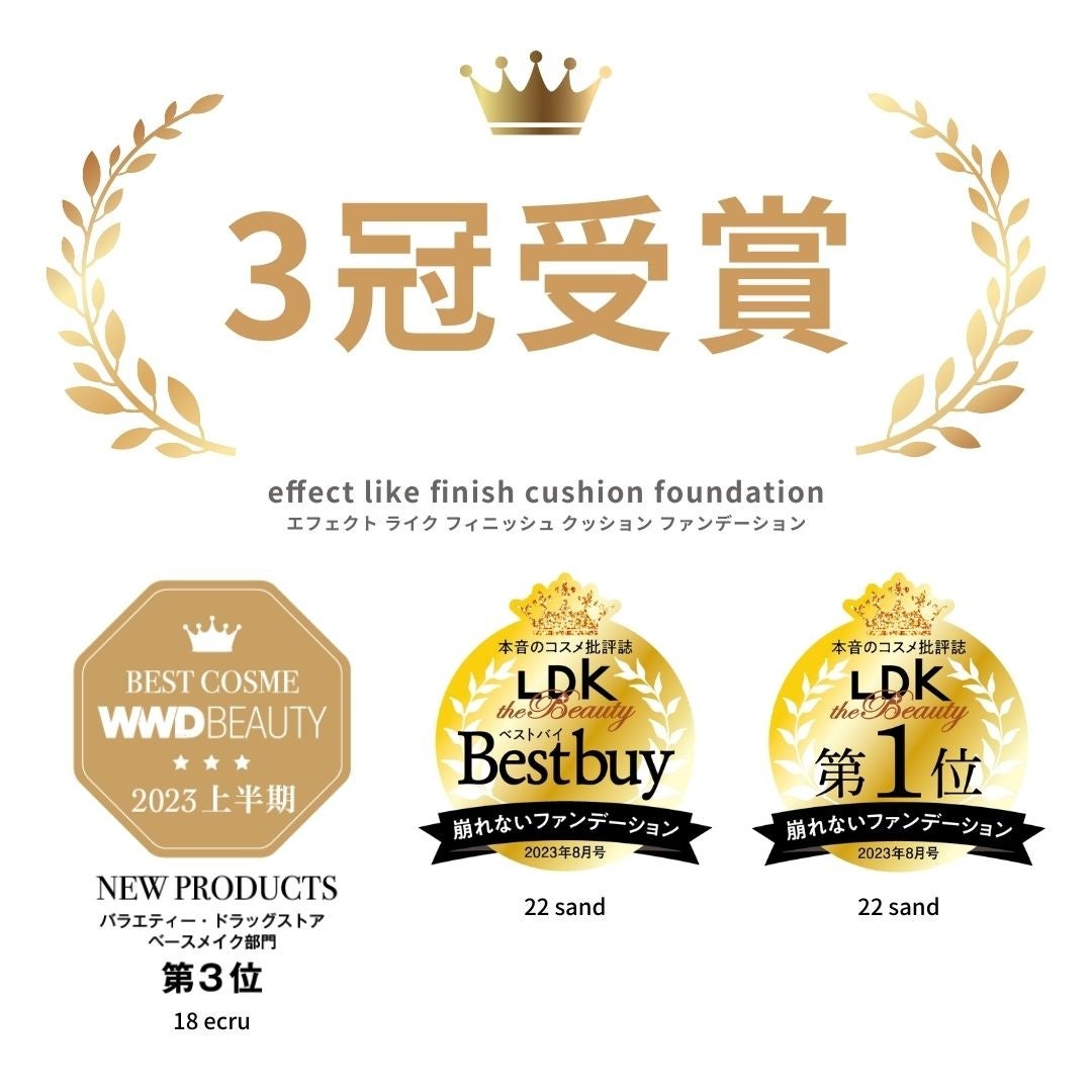2022年6月にクッションファンデーションとコンシーラーがセットになった2in1のファンデーションキット「effect like finish foundation kit」を発売し、発売初日に初回生産分10,000個が即日完売。さらにその後の再販でも発売するたびに即日完売し、沢山のお客様から反響を頂いております。その後、ご要望の多かったクッションファンデーション単体商品として「effect like finish cushion foundation」を発売。コスメを本音で評価する雑誌『LDK the Beauty8月号』にて「22 sand」が「崩れないファンデーション部門ベストバイ(最高評価)」を受賞し、WWDBEAUTY2023上半期ベストコスメ「ドラックストア・バラエティー」の「ベースメイク部門」にて「18 ecru」が第3位を受賞するなどメディアでも話題のアイテムとなりました。