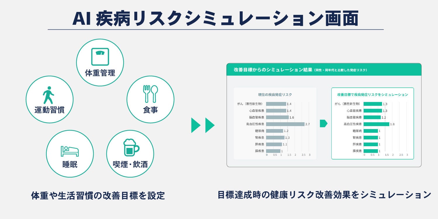 このたび、健康管理システム『HealthCore』に搭載された「AI疾病リスクシミュレーション」は、健診結果に基づき、5年以内の生活習慣病の発症リスクを同性・同年代と比較して表示。疾病発症リスクを下げるために改善が必要な生活習慣(上位5項目)を提示し、目標達成時の健康リスク改善効果をシミュレーションする。従業員は、マイページから自身の生活習慣病リスクを確認でき、生活習慣の見直しや医療機関の受診など、具体的な行動につながることが期待できる。人事・労務担当者、産業保健スタッフは、管理者画面から確認のうえ保健指導等に役立てられ、従業員の健康維持・予防において、より効果的な働きかけが可能となる。