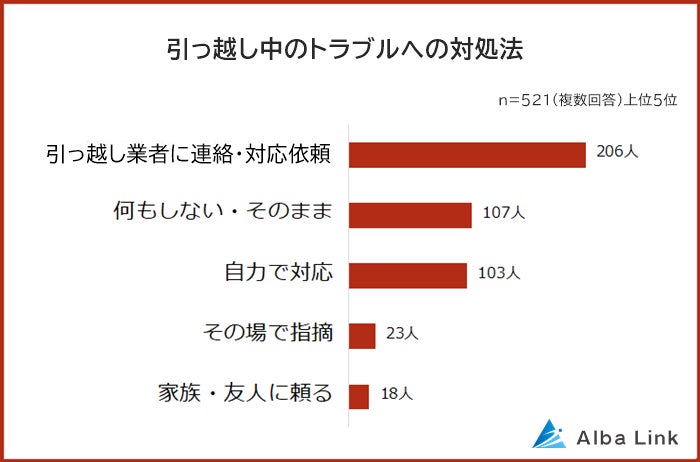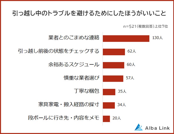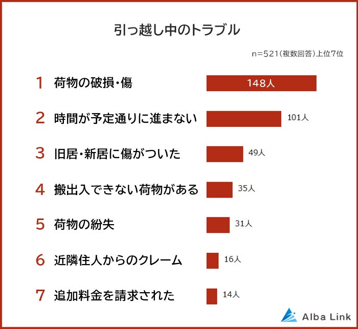株式会社AlbaLink(本社:東京都江東区、代表取締役:河田 憲二)は、引っ越しをしたことがある521人を対象に「引っ越し中のトラブルに関する意識調査」を実施し、そのデータをランキングにしました。