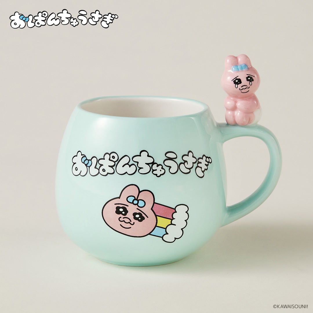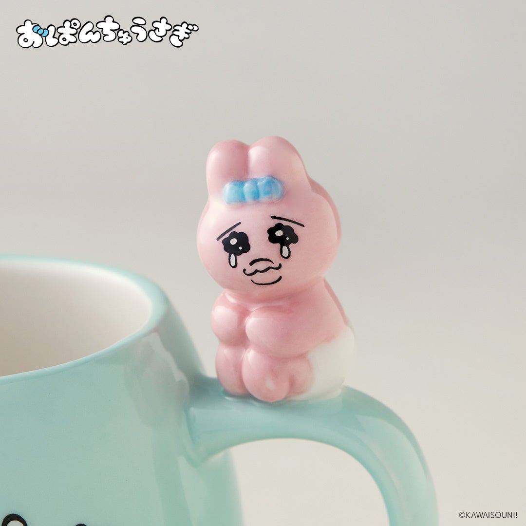 おぱんちゅうさぎが取っ手部分にちょこんと乗った、可愛さ満点のマグカップ!うるうるしているおぱんちゅうさぎの表情にキュン‥!ティータイムが楽しくなります♪