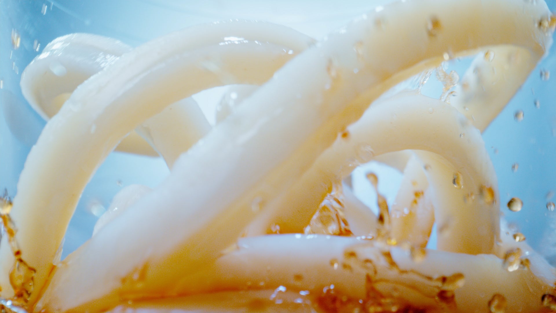 「丸亀シェイクうどん」も、ご注文をいただいてから水できゅっと締めたコシのある麺と特製だし、具材を一つひとつカップに入れてご提供いたします。国内800を超えるすべての店で毎日、100%国産小麦、塩、水のみでつくる打ち立て、茹でたてのうどんだからこそテイクアウトでも、もちもちの「丸亀食感」を楽しんでいただけます。水できゅっと締めることで、滑らかな口あたりでのどごしの良いうどんになり、噛んだ瞬間にもちっと心地よいコシを味わっていただけます。