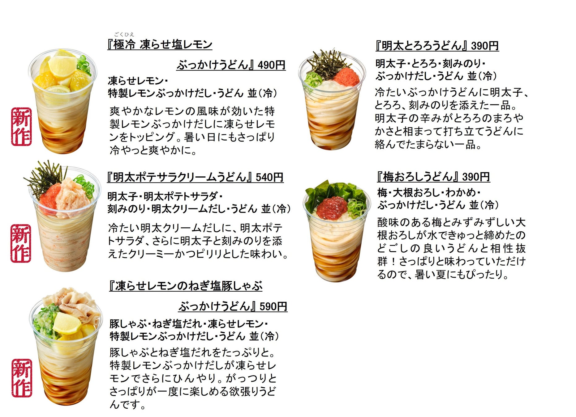 その日の気分に合わせてどこでも楽しんでいただけるよう、新登場の3種類含め全5種類をご用意しています。定番の『明太とろろうどん』 『梅おろしうどん』 も引き続きお楽しみいただけます。