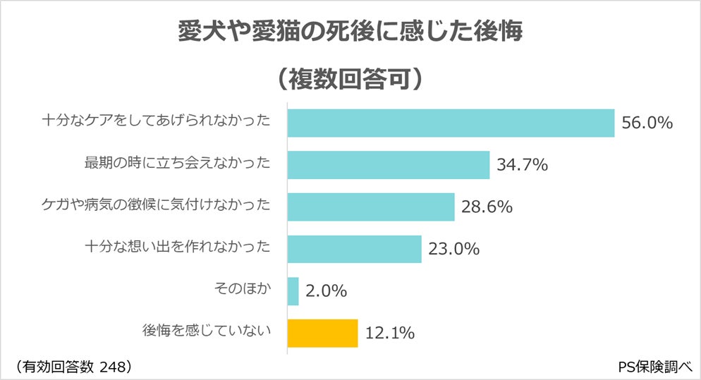 ・愛犬や愛猫の死後に感じた後悔は、「十分なケアができなかった」(56.0%)が最多。