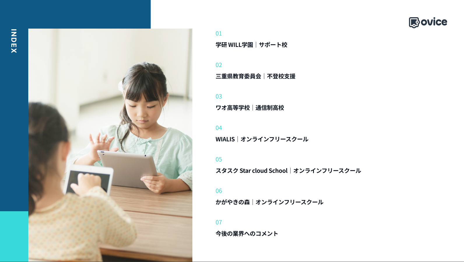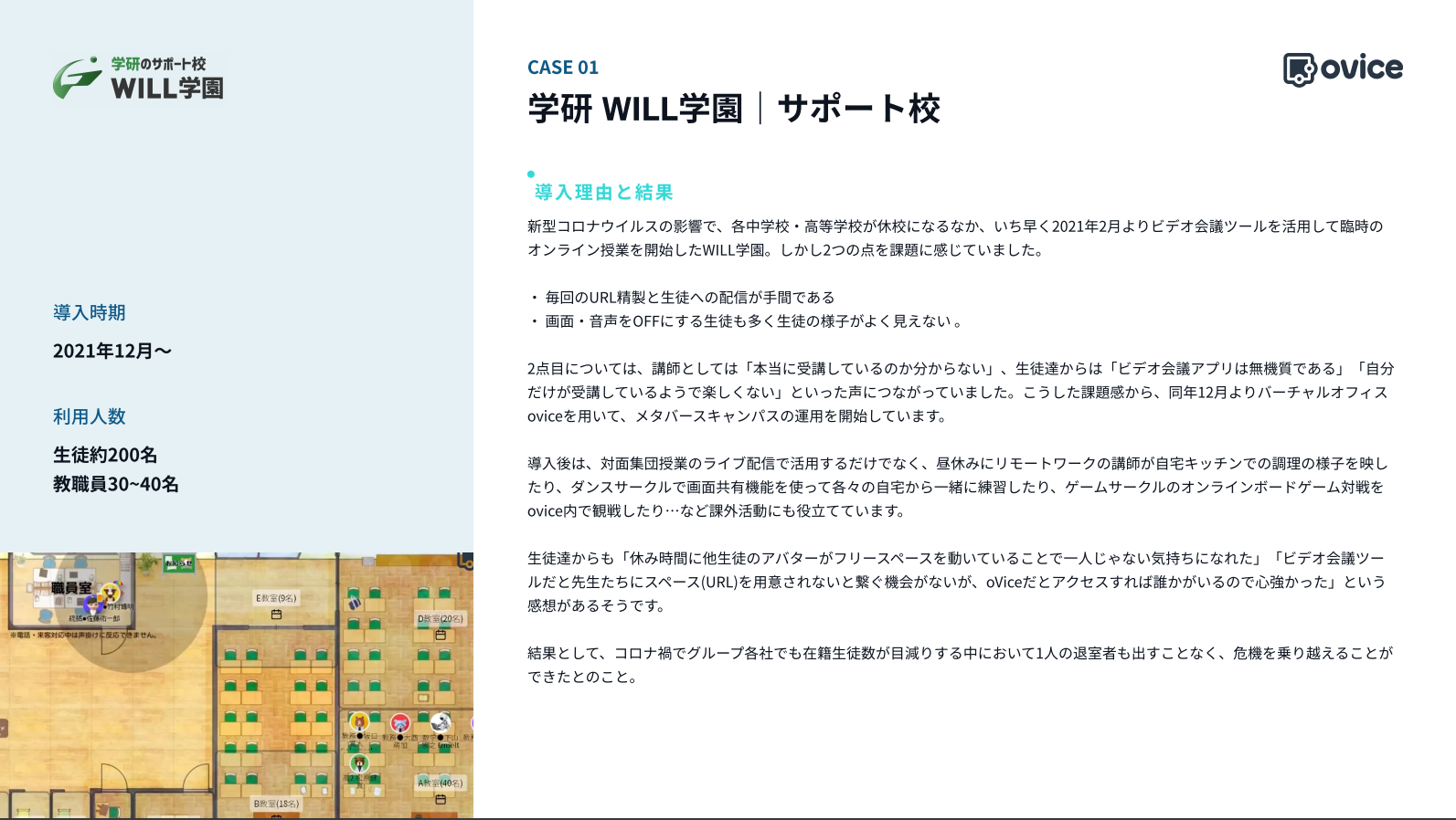 oviceはこれまでにオフィスとして多くの企業で活用されてきました。最近では、不登校児や引きこもりの児童・生徒の支援の場や、学生の交流したり授業を受けたりする場など、教育分野での活用が急速に広がっています。こうした状況から、不登校児支援の場としてoviceを活用している三重県教育委員会の活用事例動画と、オンラインフリースクールや通信制高校などの生徒が授業を受ける場としてoviceを活用している6団体の事例をまとめたホワイトペーパーを新たに作成し公開しました。