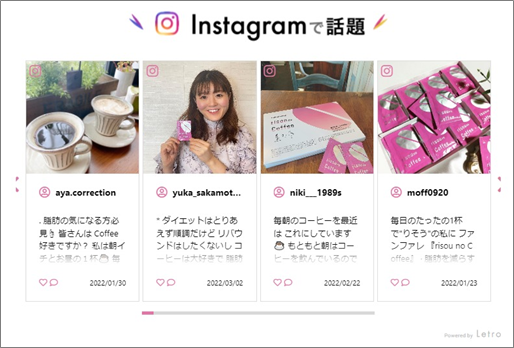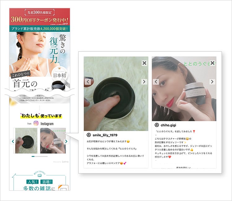 | 成果: ・新規獲得LPに掲載するInstagram投稿の運用を行うことでCVR1.13倍に改善 ・機能的な訴求に活用できるUGCを選出し、"動的"に表示。その後も、LPにおけるUGCの掲載位置や、UGCの表示デザインの検証~運用を順に実施することで「運用型UGC」を体現 |