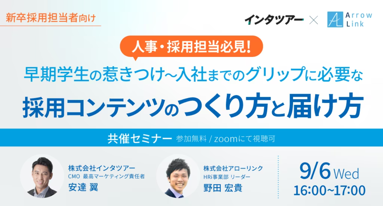 本セミナーでは、株式会社インタツアーのCMO・最高マーケティング責任者安達より、 母集団形成における認知の高め方や歩留まり/内定承諾率を高める為のコツについて解説いたします。