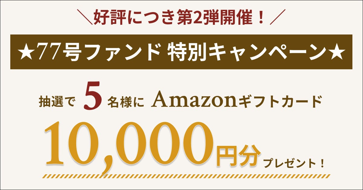 そこで、より多くのみなさまから、より多くのご投資をいただくきっかけとすべく、本ファンド特別キャンペーンを実施いたします。本ファンドへご出資いただいた投資家のみなさまの中から、抽選で5名様にAmazonギフトカード1万円分をプレゼントします。