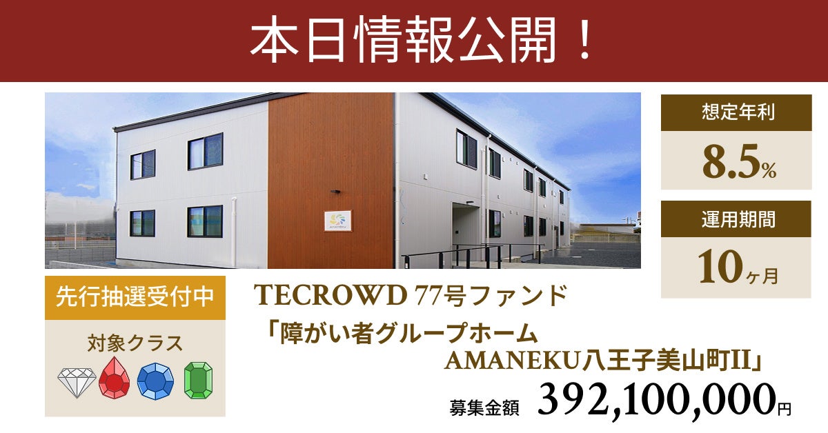【想定年利8.5%】不動産クラウドファンディング「TECROWD」、国内開発型ファンド「障がい者グループホーム AMANEKU八王子美山町Ⅱ」を投資対象とするファンド情報公開