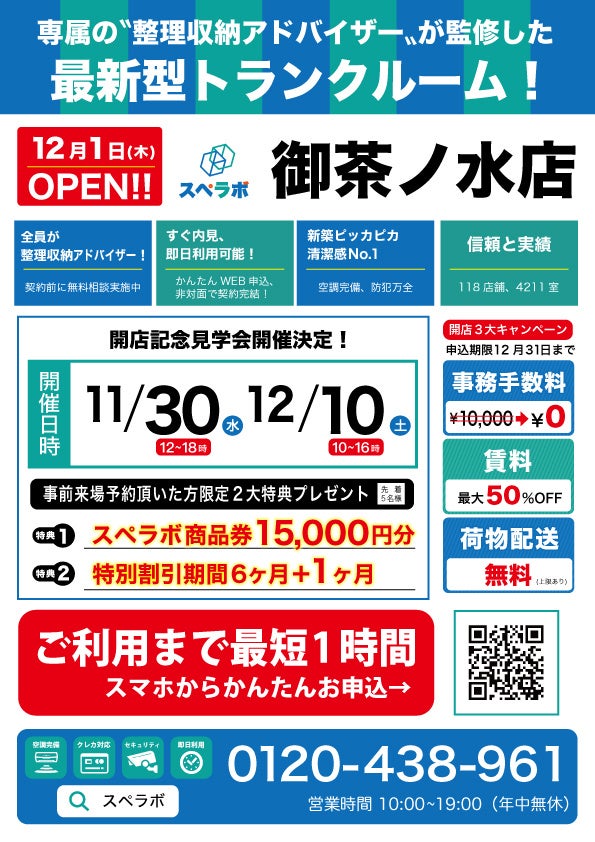 【12月1日(木)オープン】見学から契約、解約まで完全非接触・非対面、お申し込みからご利用まで最短1時間!都内、大阪などにて絶賛運営中のトランクルーム【スペラボ】が御茶ノ水、秋葉原駅近くに出店!