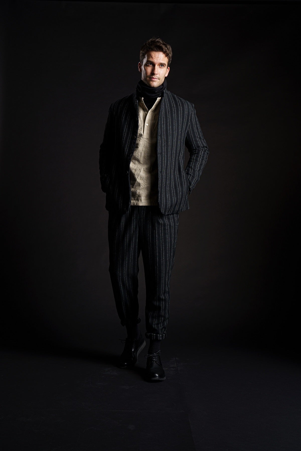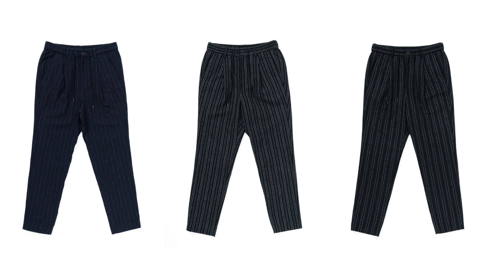 ヒップ~腿回りは若干の余裕を持たせ、裾に向けてテーパードさせたイージートラウザーズ。股上を少し深めにとり、ルーズな雰囲気を演出した。 ウールの一大産地として名高い尾州一宮産のウールにwjk独自のパターンのストライプを施した別注素材を作製。ストライプの幅、配色、彩度に拘ったオリジナル素材を使用し、他との差別化を図るには最適な一着に仕上げた。