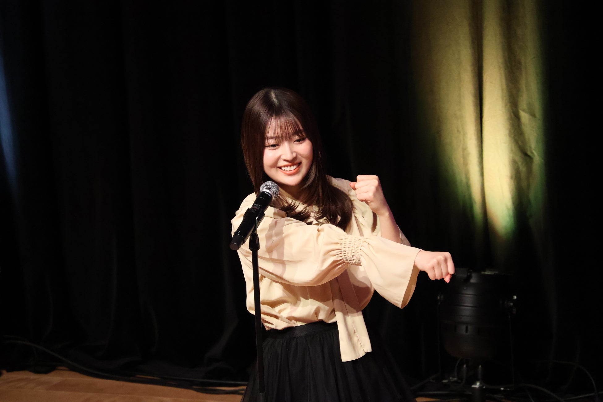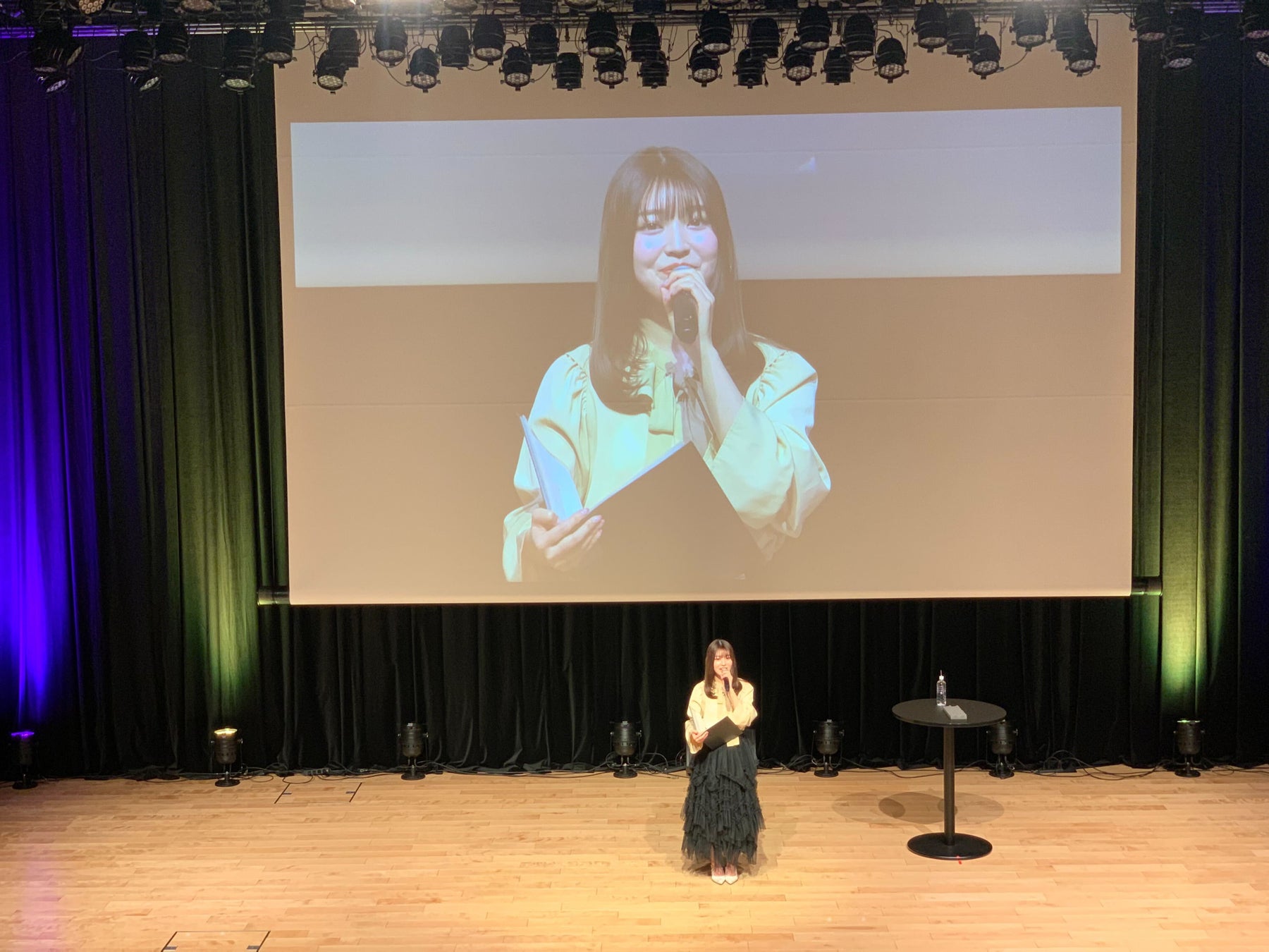 イベントがスタートすると、阪口さんが元気いっぱいに登場。「本日は、阪口珠美ファンクラブイベント『たまみとこんにちは』に集まっていただき、本当にありがとうございます。」と呼びかけると、客席からは大きな歓声が上がりました。「初めましての方も、たまみを知ってるって方も、もっともっと魅力を伝えられるように頑張りますので、今日はみんな”だいすこ”になっちゃってください!」と阪口さん特有の愛情表現”だいすこ”を交えた挨拶に、会場のテンションも一気にアップ。