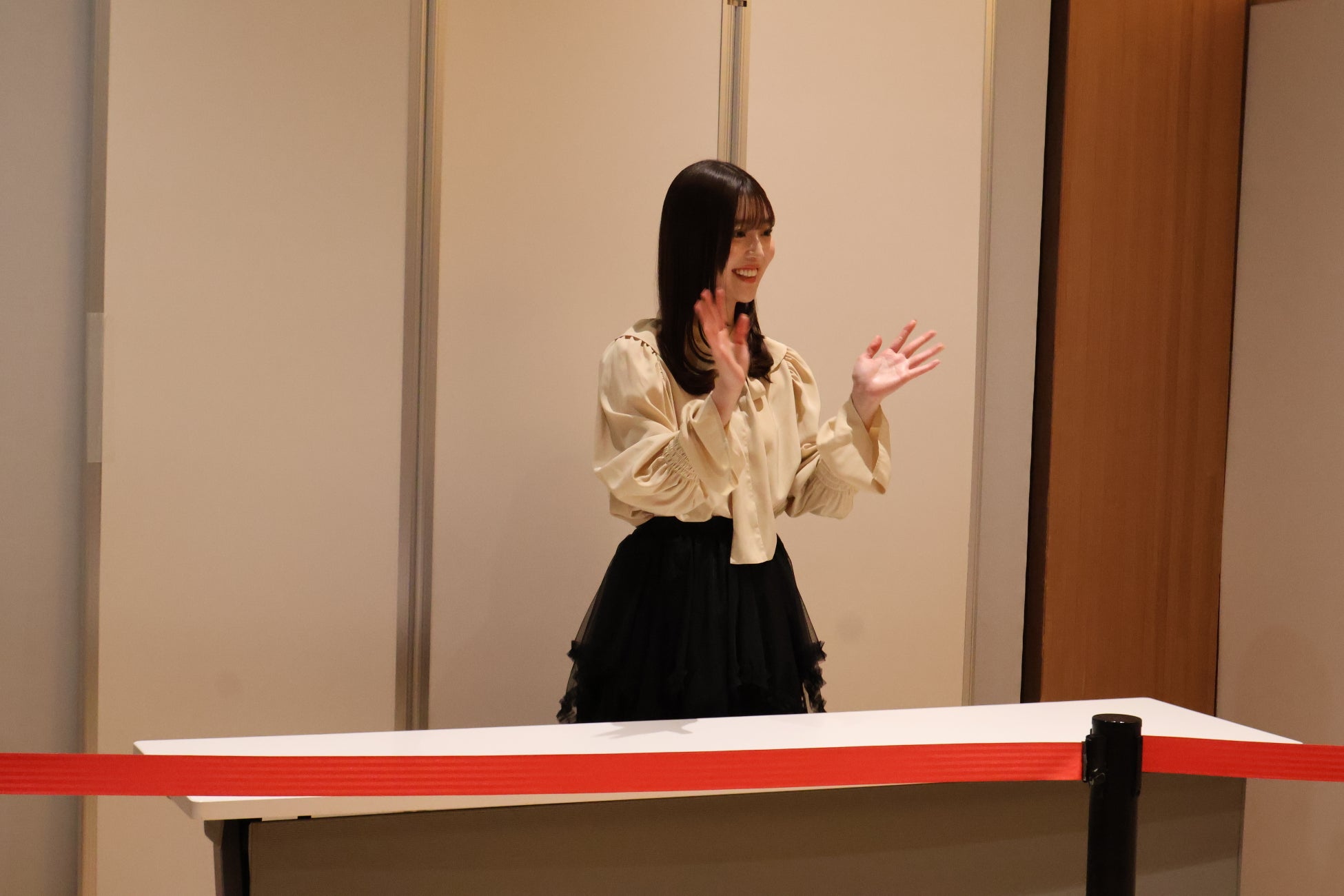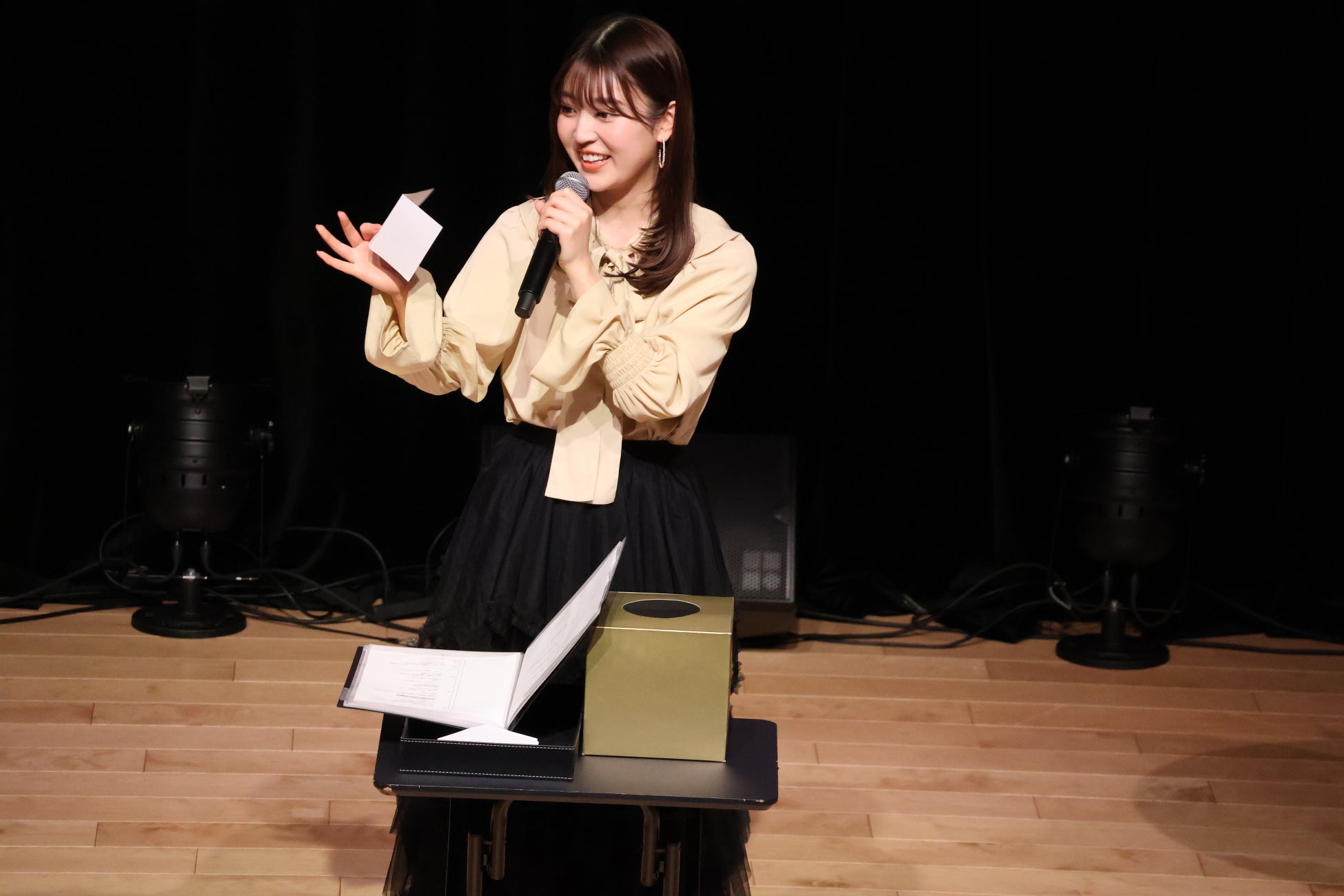 続いては、阪口さんに関するクイズ大会『たまみクイズSHOW!』が行われました。「今やりたいお仕事はなんでしょう?Aはコスメのモデルさん、Bはアボカドジュース屋さん。どちらでしょうか?」をはじめ、阪口さんのことをどれだけ知っているかが試されるユニークな問題が次々と出題。正解は「Aのコスメのモデルさん」と回答し、「大好きなコスメのモデルとして、お店に大きな看板を飾れたら嬉しい」と今後の活動について話しました。そして、最後まで正解し続けた5名には、阪口さんのサイン入りチェキをプレゼント。クイズの後には「みなさん、たまみのことよく知れましたか?」と問いかける阪口さんの姿に、会場も和やかなムードに包まれました。