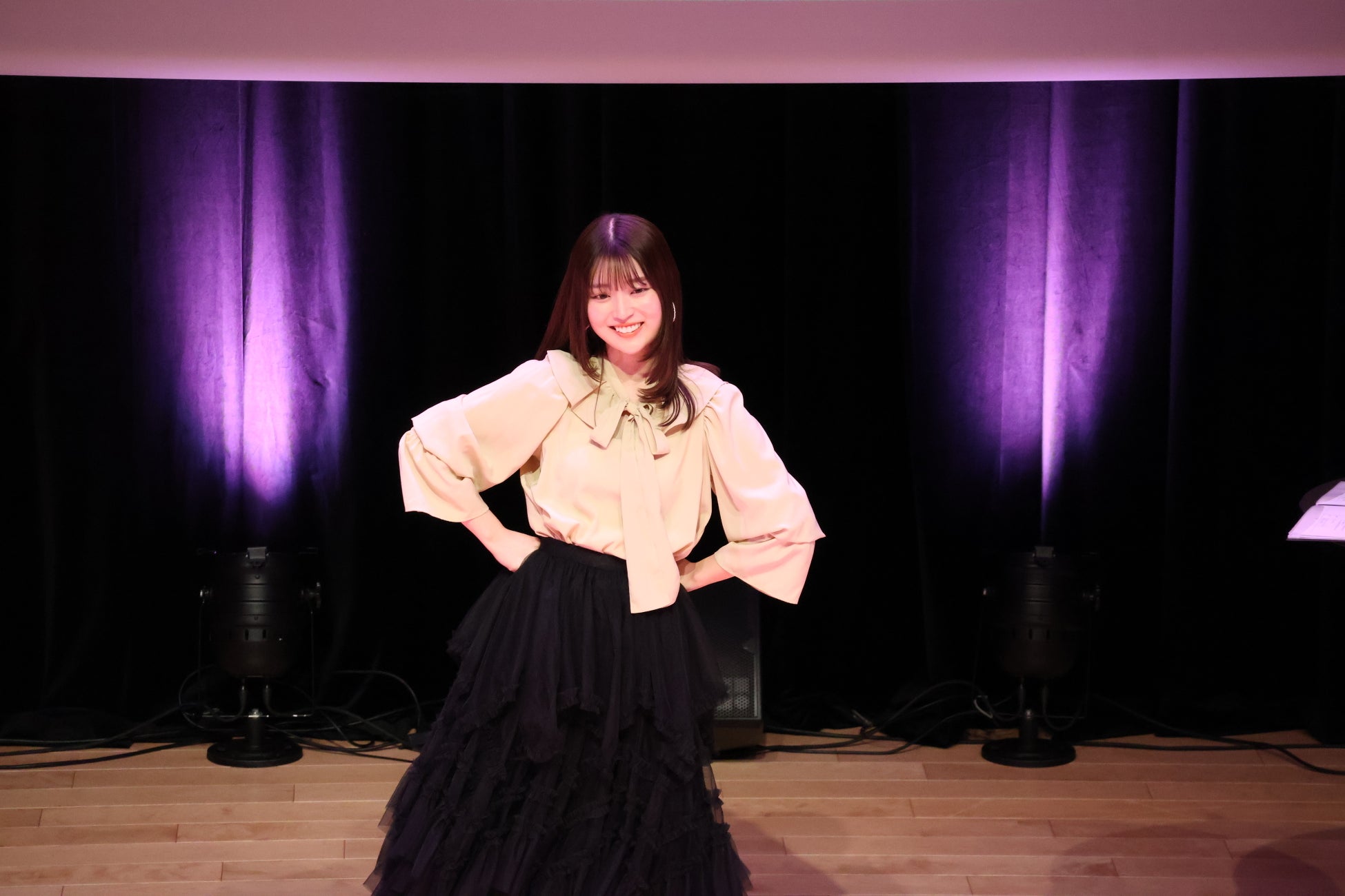「今回は踊りたかった気持ちを解放して、たくさん素敵な曲を私が踊れたらいいなと思って、この企画を用意させていただきました。」と意気込んで始まったのは、流れてくる楽曲に合わせて即興で踊るランダムダンスのコーナー。トレンドのアイドルソングから、自身にとって思い入れのある楽曲まで、多彩なラインナップに乗せて、阪口さんはキレのあるダンスを次々と披露。久しぶりのパフォーマンスに少し緊張した様子も見せながら、とびきりの笑顔でファンの皆さんと一緒に盛り上がりました。