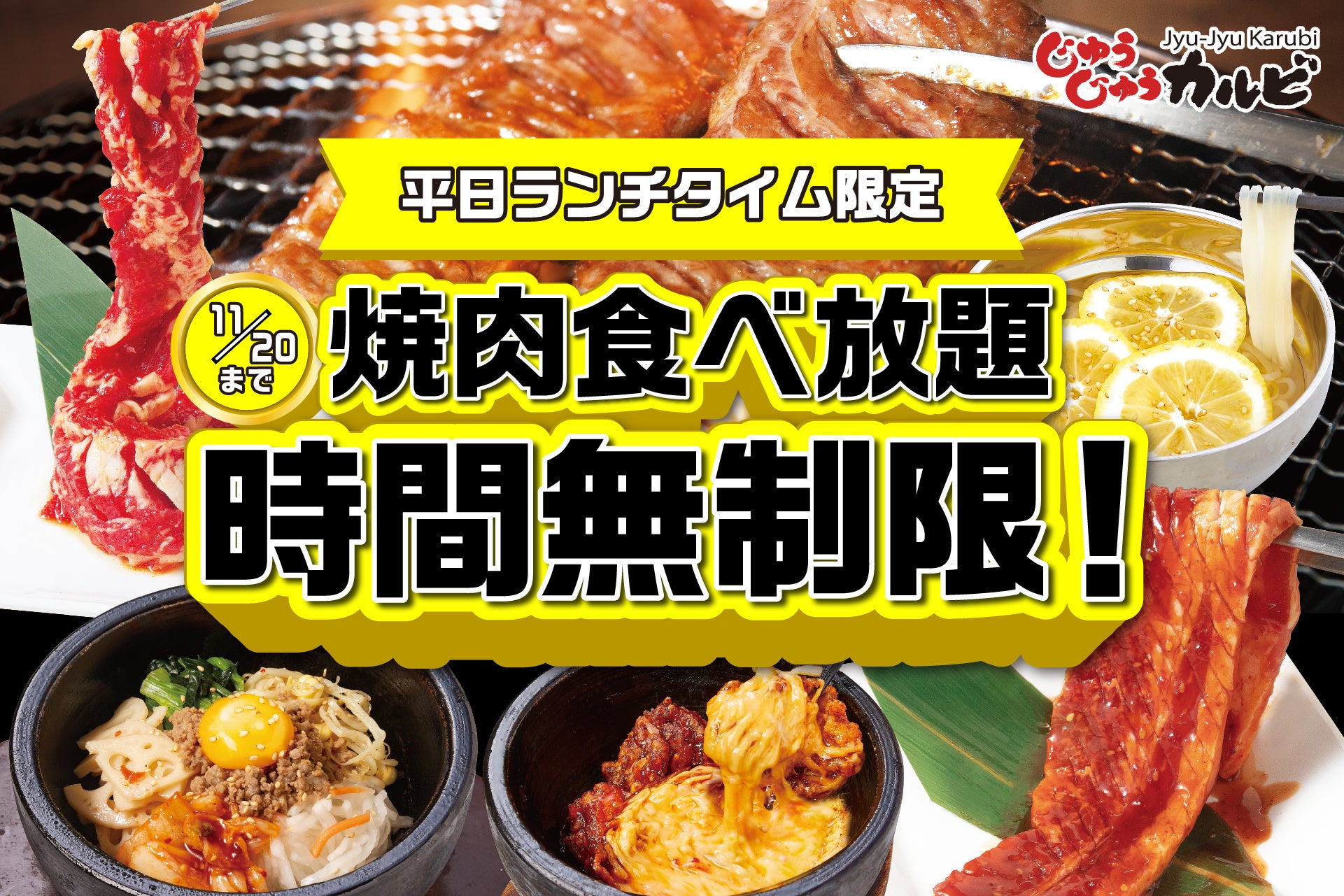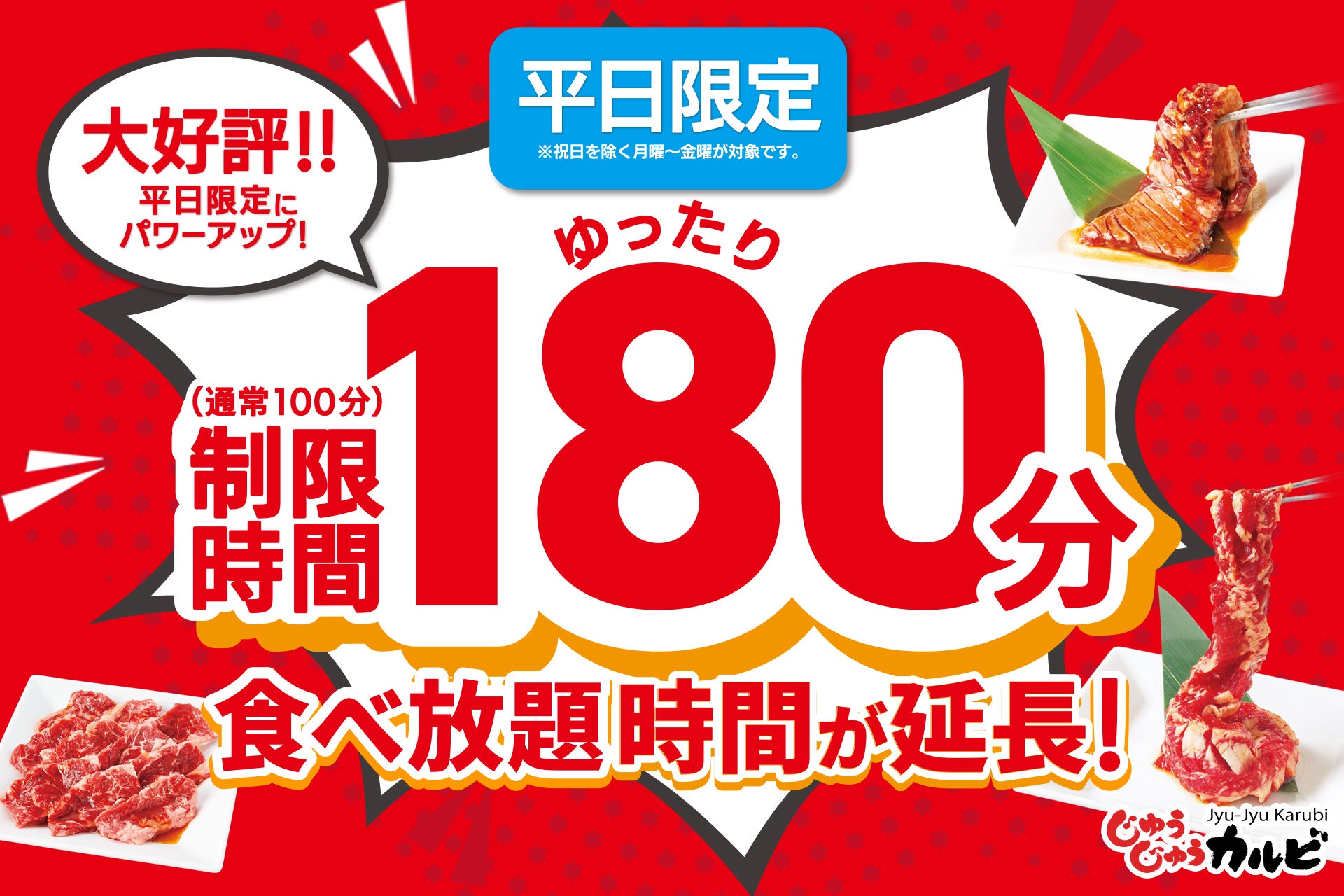 じゅうじゅうカルビでは、月~金曜日限定で食べ放題コースの時間延長(通常100分のところ180分)を実施しております。※和光新倉店は除く