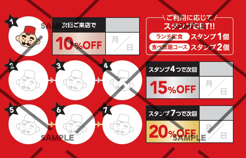 ・食べ放題コースのご注文で2つ、単品または定食のご利用で1つスタンプを押印します。