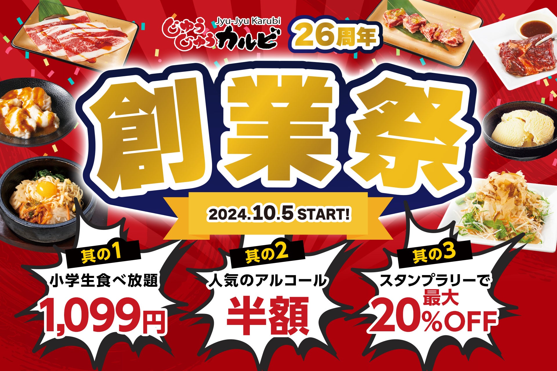株式会社トマトアンドアソシエイツ(本社:兵庫県西宮市、代表取締役社長:小林 大二)が運営する、焼肉食べ放題「じゅうじゅうカルビ」では、2024年10月5日(土)より、創業26周年を記念して「創業祭」を開催いたします。