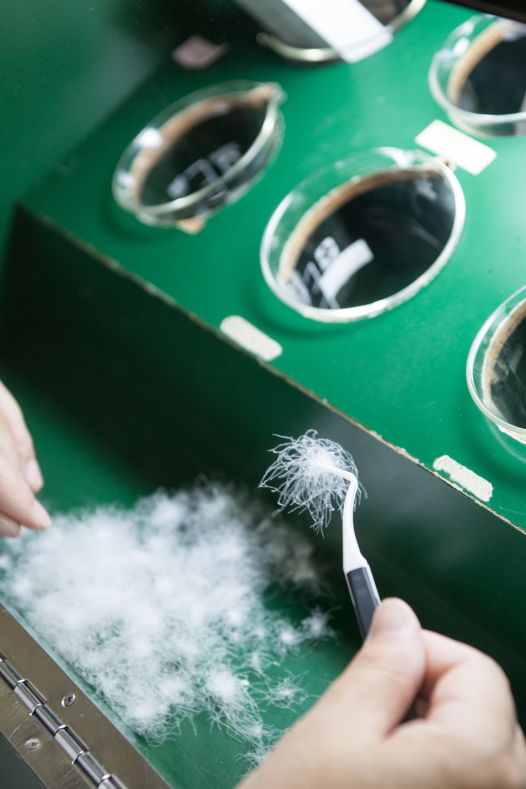 河田フェザーは、明治24年創業。長年にわたり高品質な羽毛の提供を追求し、原料調達から精製加工までを一貫して自社で管理しています。多気郡明和町のきめ細やかな地下水を使用し、不純物や劣化部分を丁寧に取り除くことで、新毛以上の清浄度を持つリサイクル羽毛へと再生させています。