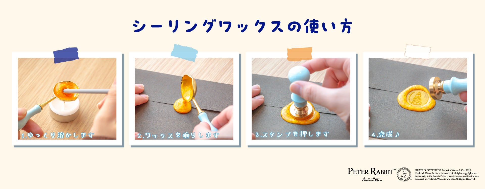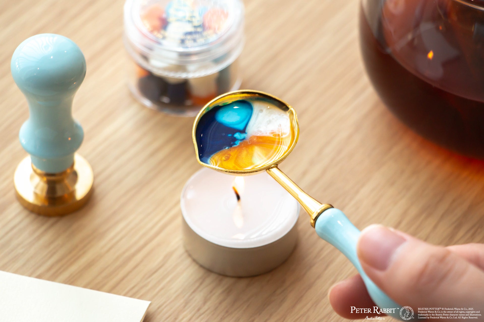 ピーターラビットのカラーリングでデザインされた「日付印」「スタンプパッド」「シーリングワックスセット」「ワックスピル」が登場!