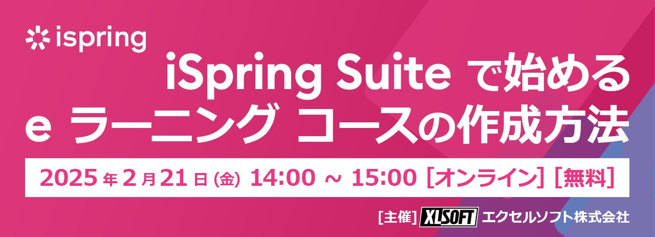 エクセルソフト株式会社 (東京都港区) は、 iSpring Suite で始める e ラーニング コースの作成方法 無料セミナーをオンラインで 2025年 2月 21日 (金) に開催いたします。