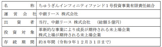 中国銀行(岡山市北区丸の内一丁目15番20号 頭取 加藤 貞則)ならびに中銀リース(岡山市北区丸の内一丁目14番17号 取締役社長 西明寺 康典)は、スタートアップ企業を出資対象とする『ちゅうぎんインフィニティファンド』が株式会社FABRIC TOKYOの実施する第三者割当増資を引受けましたことを、お知らせいたします。