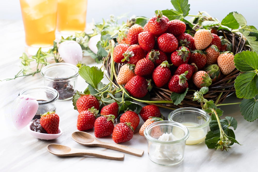 ・複数の有名ブランドいちごを2粒ずつ食べ比べた後、本日のいちご1種類が食べ放題 ・4種類のディップ(コンデンスミルク、チョコレートソース、ホイップクリーム、あんこ) ・ドリンク1杯 ・先着200名さま限定:いちごの形をしたもなかを2枚1セット |