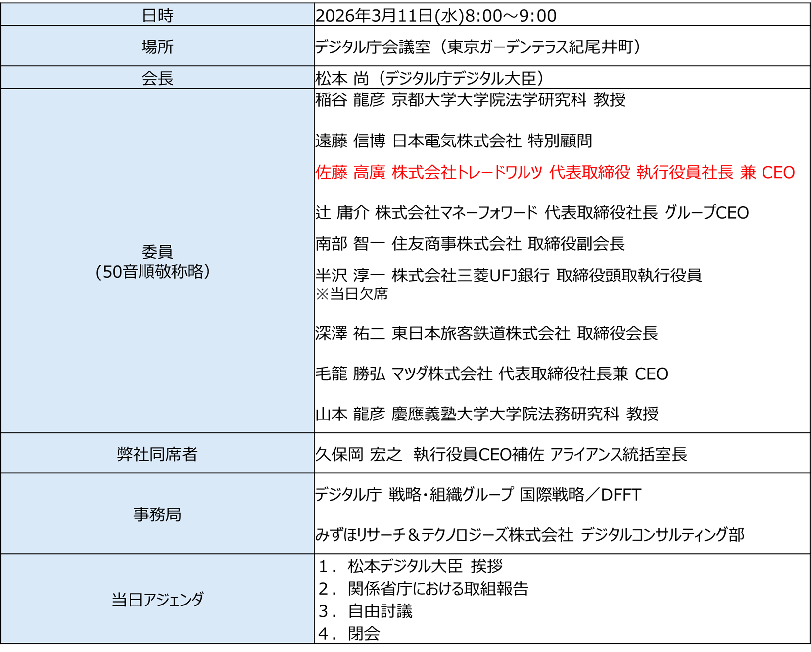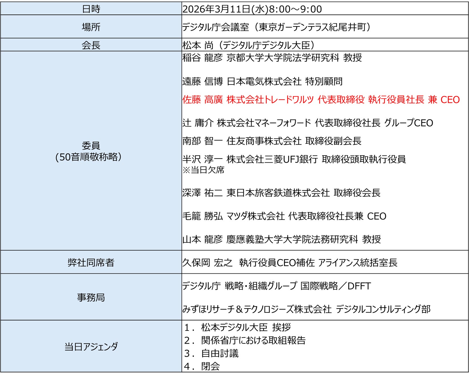 貿易情報連携プラットフォーム「TradeWaltz®︎」を運営する株式会社トレードワルツ(本社:東京都港区、代表取締役社長:佐藤 高廣、以下「トレードワルツ」)は、2026年3月11日にデジタル庁で開催された「第3回国際データガバナンスアドバイザリー委員会」に出席し、貿易実務のデジタル化による日本の国際競争力向上に向けた官民連携について意見交換を行いました。