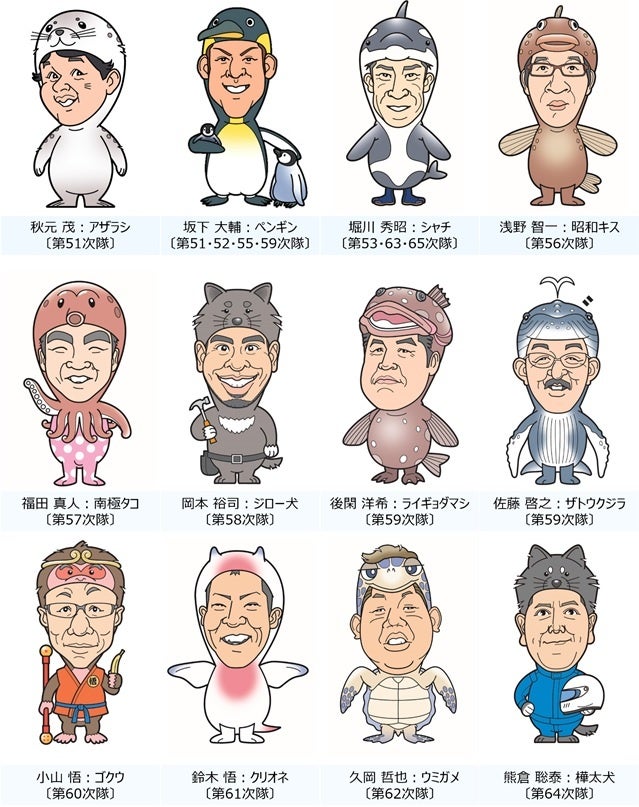 南極地域観測隊への参加経験を持つ社員を「南極クラス」の講師として派遣しており、南極地域観測隊参加後の1年間は専任、その後は現職と兼務しながら講演活動を行っています。現在は12名が講師として活躍。参加する子どもたちが楽しく受け入れやすいように、南極の生き物を主なモチーフにし、各講師のオリジナルキャラクターを作成しています。