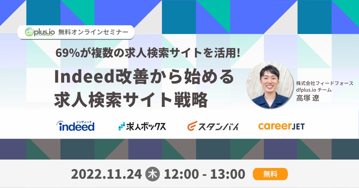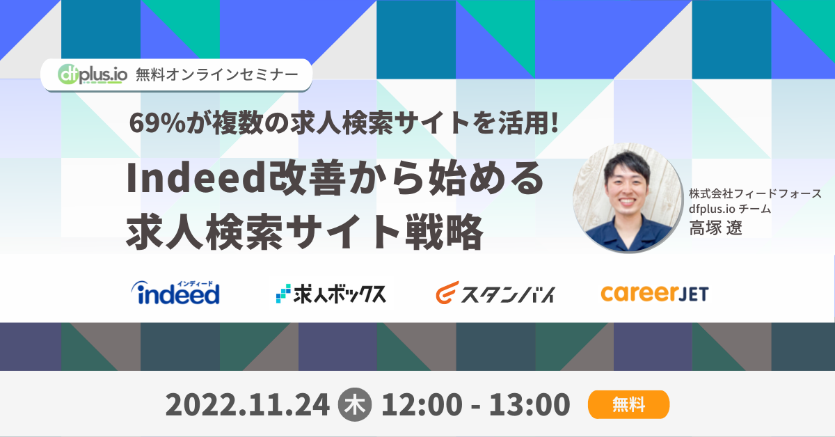 株式会社フィードフォース(所在地:東京都文京区、代表取締役:塚田 耕司、以下「フィードフォース」)が提供する、マーケターのためのデータフィード管理ツール「dfplus.io」は、無料オンラインセミナー「69%が複数の求人検索サイトを活用!Indeed改善から始める 求人検索サイト戦略」を2022年11月24日(木)に開催いたします。