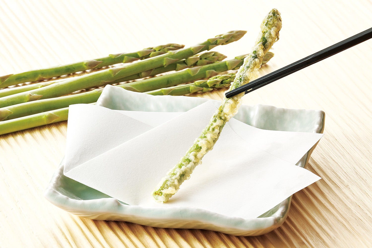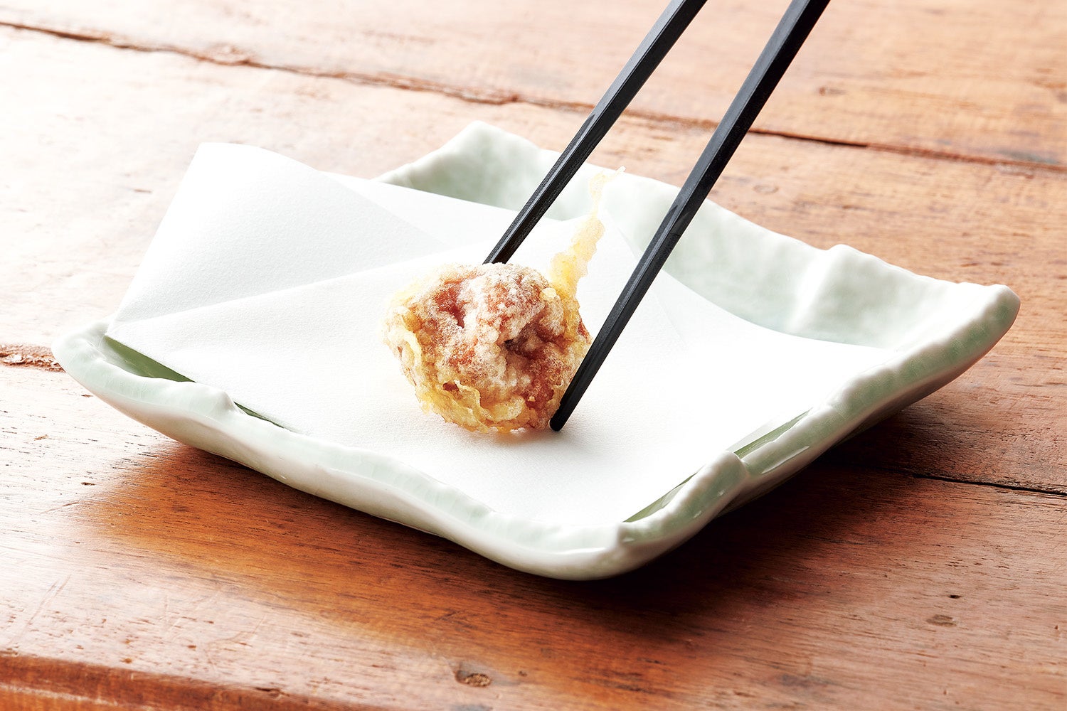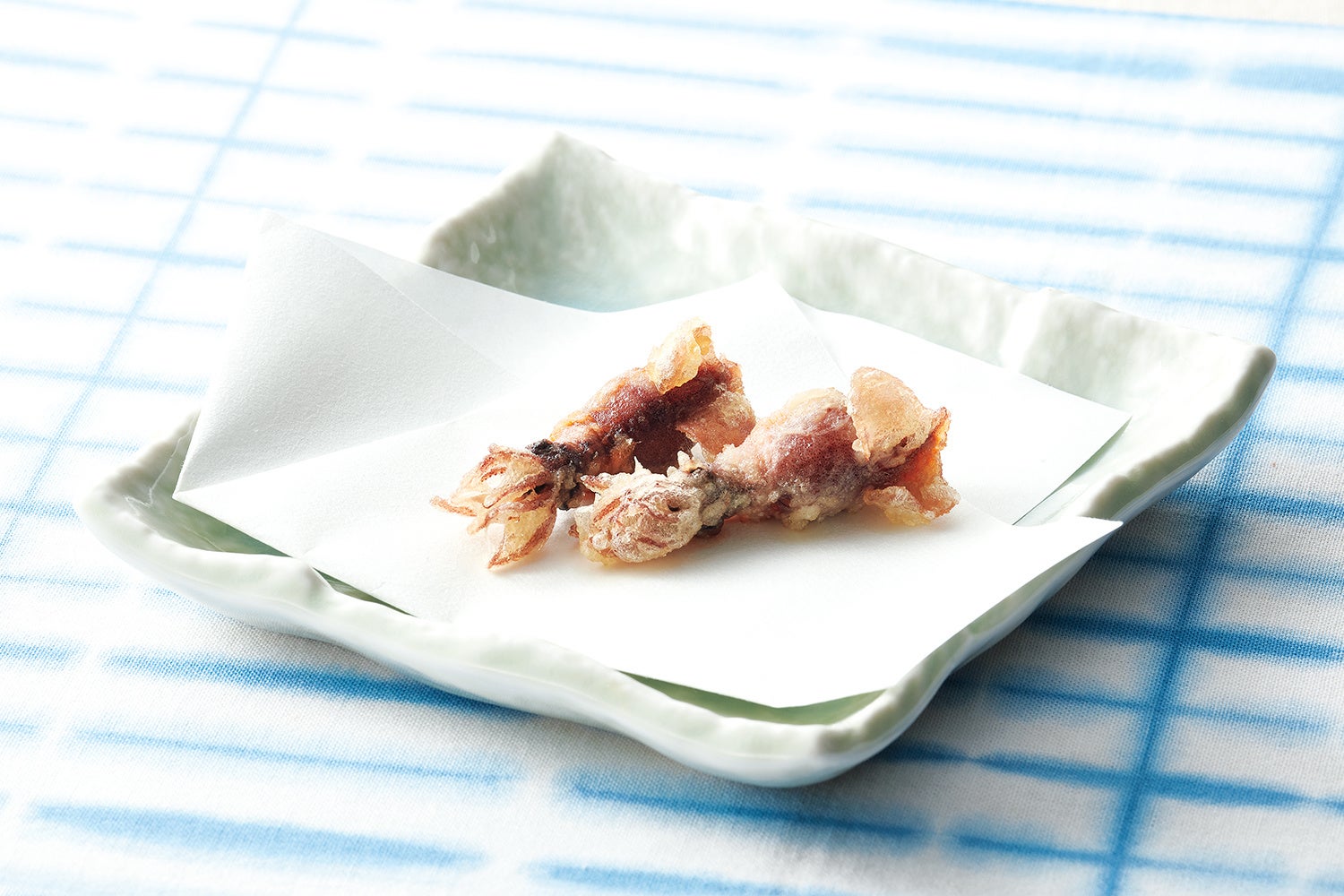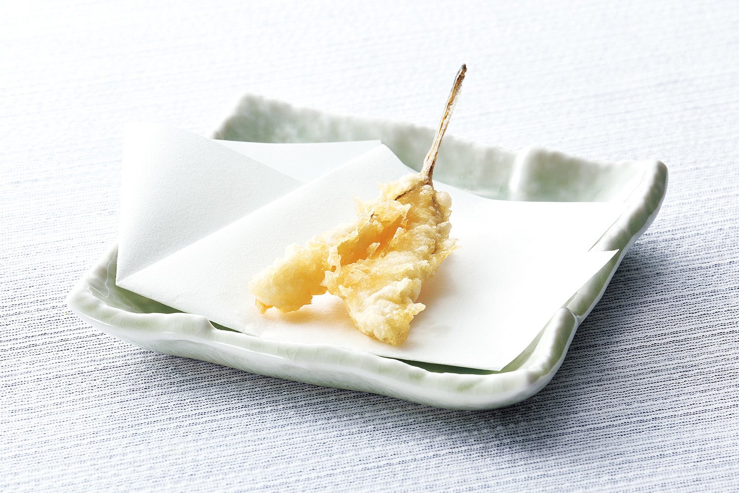 『初夏天丼』は、宮城県気仙沼港で水揚げされ、静岡県焼津にて藁でいぶし香ばしくたたきにした、「鰹のたたき」を天ぷらにしてのっけた一品。旨みのつまった“あさり”と“生姜”を組み合わせた、「あさりと生姜のかき揚げ(三つ葉入り)」との相性は抜群です。天ぷらによくあう「めごち」と、“岩下の新生姜®”でおなじみの、岩下食品株式会社から「新芽生姜」、アクセントとなる「紀州南高梅」で、爽やかな風味と食感のあるバランスのよい天丼に仕上げました。