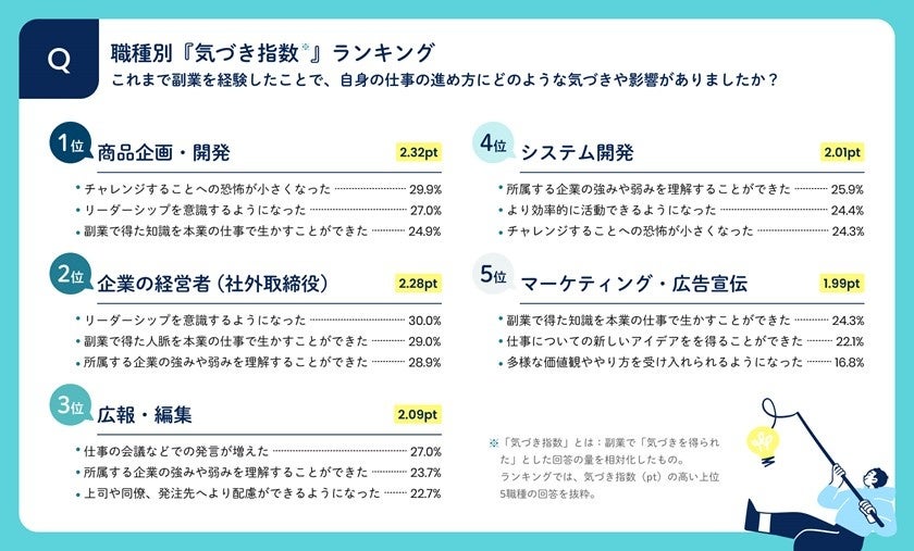 「副業を経験したことで、自身の仕事の進め方にどのような気づきや影響がありましたか?」という質問に対して、「気づきを得られた」とした回答の量を相対化したものを『気づき指数』とし、職種別で『気づき指数』が高かったものをランキングにしました。結果を見てみると、“商品企画・開発“が最も『気づき指数』が高いことが分かりました。どのような気づきがあったかを職種別で見ると、“商品企画・開発“では「チャレンジすることへの恐怖が小さくなった」との回答が最多でした。“企業の経営者“では「リーダーシップを意識するようになった」、「副業で得た人脈を本業の仕事で生かすことができた」との回答が多く、副業でリーダーシップを身に付けたことや、人脈を得たことが伺えます。“広報・編集“では「仕事の会議などでの発言が増えた」の回答がもっとも多い結果となりました。また、「気づきや影響は特になかった」との回答が“企業の経営者““商品企画・開発“では0%と、他の職種と比較すると、副業によるポジティブな影響を受けやすいと考えられます。