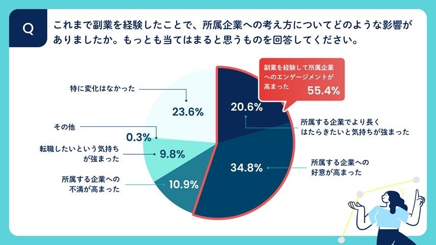 本調査では、副業経験を通じて自身の仕事への気づきや副業先へのプラスの影響だけでなく、副業をすることで現在所属している企業へのエンゲージメントが高まっている層が過半数を占めることが分かったとても興味深い調査でした。