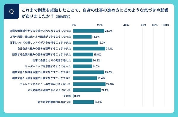 「副業を経験したことで、自分自身の仕事の進め方にどのような気づきや影響がありましたか?」という質問で最も回答が多かったのは、「チャレンジすることへの恐怖心が小さくなった」が24.3%、次いで「自分自身の強みや弱みを理解することができた」が24.1%、「多様な価値観ややり方を受け入れられるようになった」が23.2%、「副業で得た知識を本業の仕事で生かすことができた」が23.0%となりました。副業を経験して、自分自身を客観視し、よりチャレンジできる自律的な人材へと成長したことで、現職にも好影響があったことが伺えます。その他、「仕事についての新しいアイデアを得ることができた」、「副業で得た知識を本業の仕事で生かすことができた」、「副業で得た人脈を本業の仕事で生かすことができた」など、副業での経験が現職での仕事に直接良い影響があったとの回答も目立ちました。