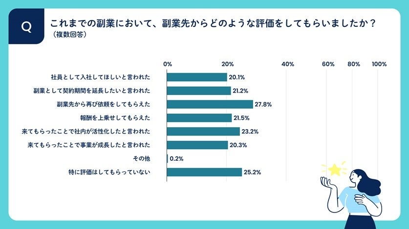 職種別で「これまでの副業において、副業先からどのような評価をしてもらいましたか?」という質問では、特に評価をもらっていないものを除くと、「副業先から再び依頼をしてもらえた」が最多で27.8%でした、次いで、「来てもらったことで社内が活性化したと言われた」が23.2%、「報酬を上乗せしてもらえた」が21.5%、「副業として契約期間を延長したいと言われた」は21.2%、「来てもらったことで事業が成長したと言われた」は20.3%、「社員として入社してほしいと言われた」が20.1%となりました。この結果から副業人材への評価が非常に高く、再び依頼をしたり、契約期間を延長したりしているケースが多いことが分かります。また、「社内が活性化した」「事業が成長した」という評価も多く、副業人材が受け入れ企業の事業成長にプラスの影響を与えていることが読み取れます。