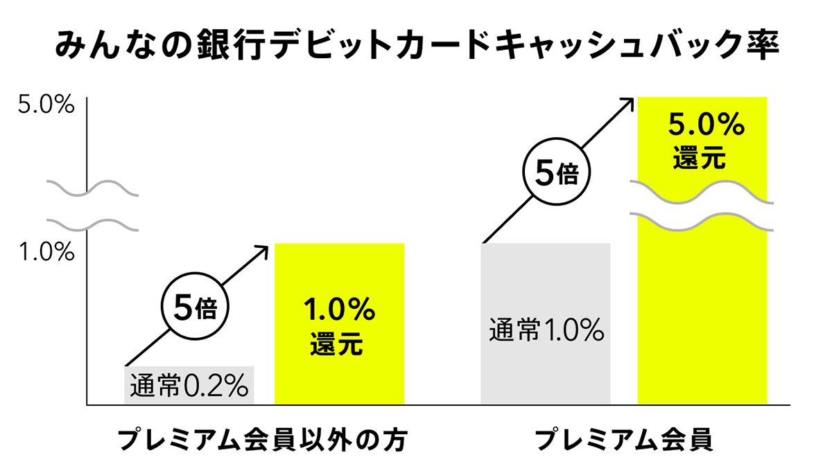 みんなの銀行のプレミアム会員の方は5.0%(通常1.0%)、プレミアム会員以外の方も1.0%(通常0.2%)とお得にキャッシュバックが受けられ、さらにビックポイント8%(*1)(*2)も付与されます。