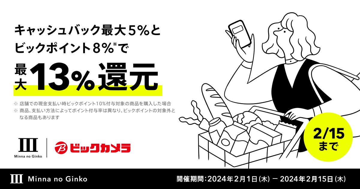 キャンペーン期間中にビックカメラ(店舗またはビックカメラ.com)で、みんなの銀行デビットカードで決済した金額のキャッシュバック率が5倍になります。