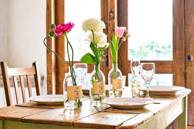 そのアイデアを活かし、店内のあらゆる箇所には、フラワーベースにアップサイクルされたガラス容器がディスプレイされています。