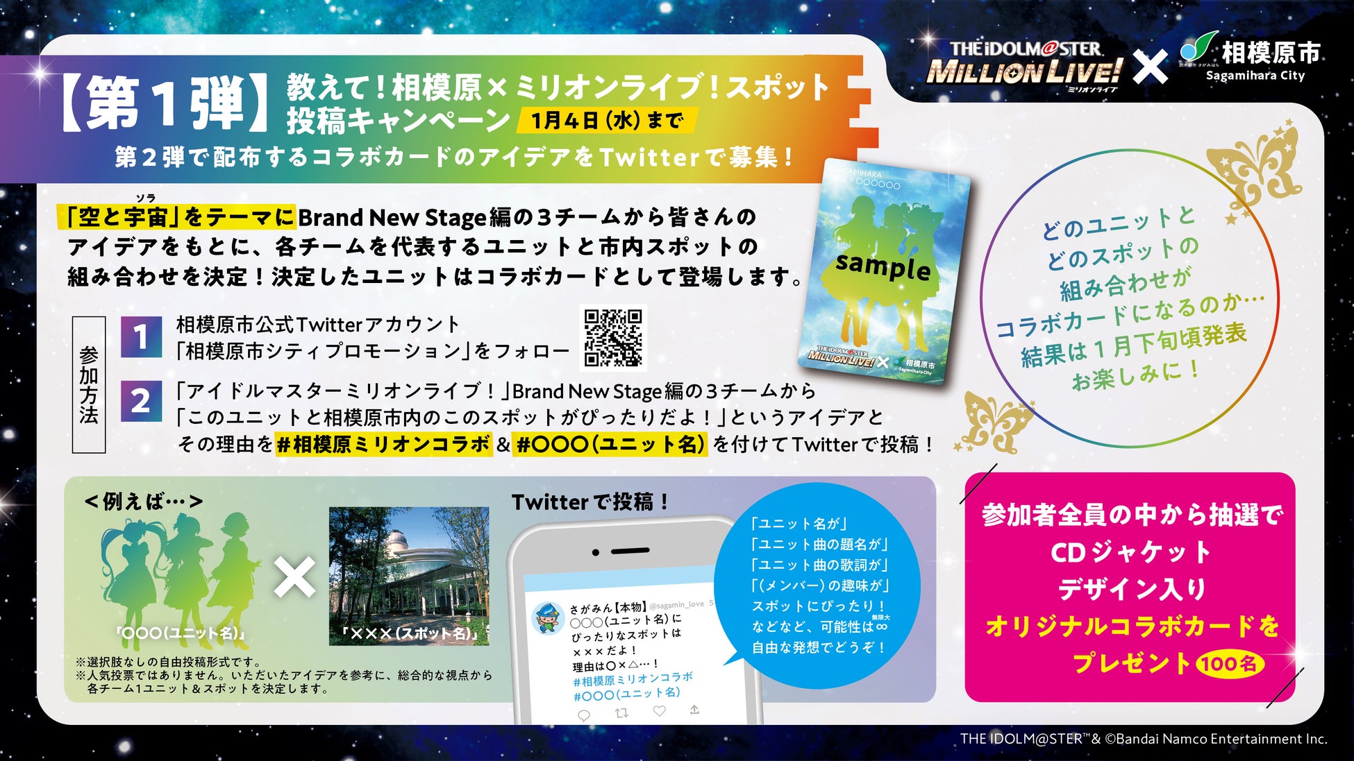 2 「アイドルマスター ミリオンライブ!」Brand New Stage編の3チームから「このユニットと相模原市内のこのスポットがぴったりだよ!」というアイデアとその理由を「#相模原ミリオンコラボ + #〇〇〇(ユニット名) 」を付けてTwitterで投稿