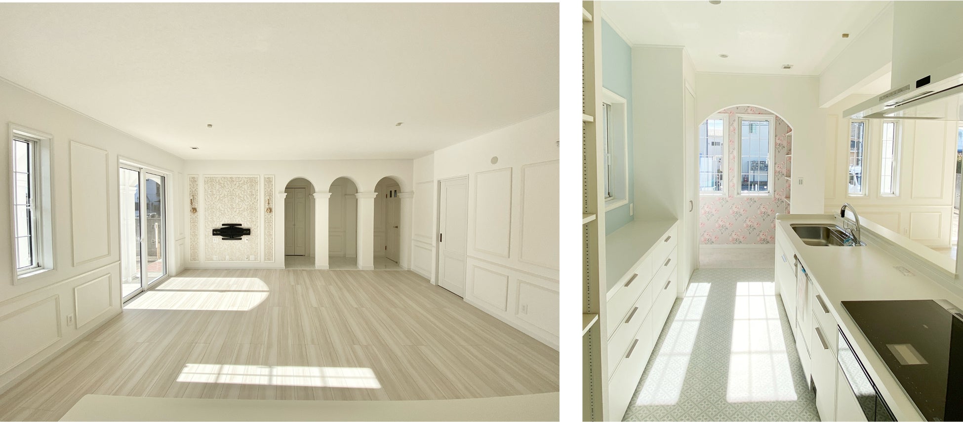 室内3連アーチホールがこだわりポイント。大理石調のフロアやモールディングをふんだんに使用し、白を基調としたエレガントな空間としました。内外のアーチ・モールディングはサイズ・バランスも十分吟味して決定。アクセントクロスも効果的に採用しています。