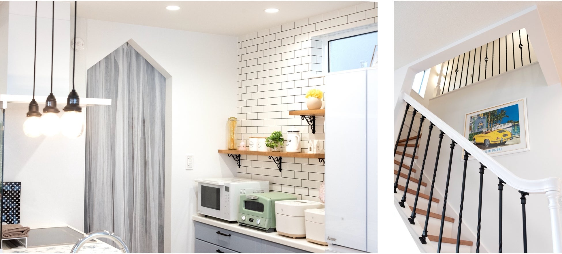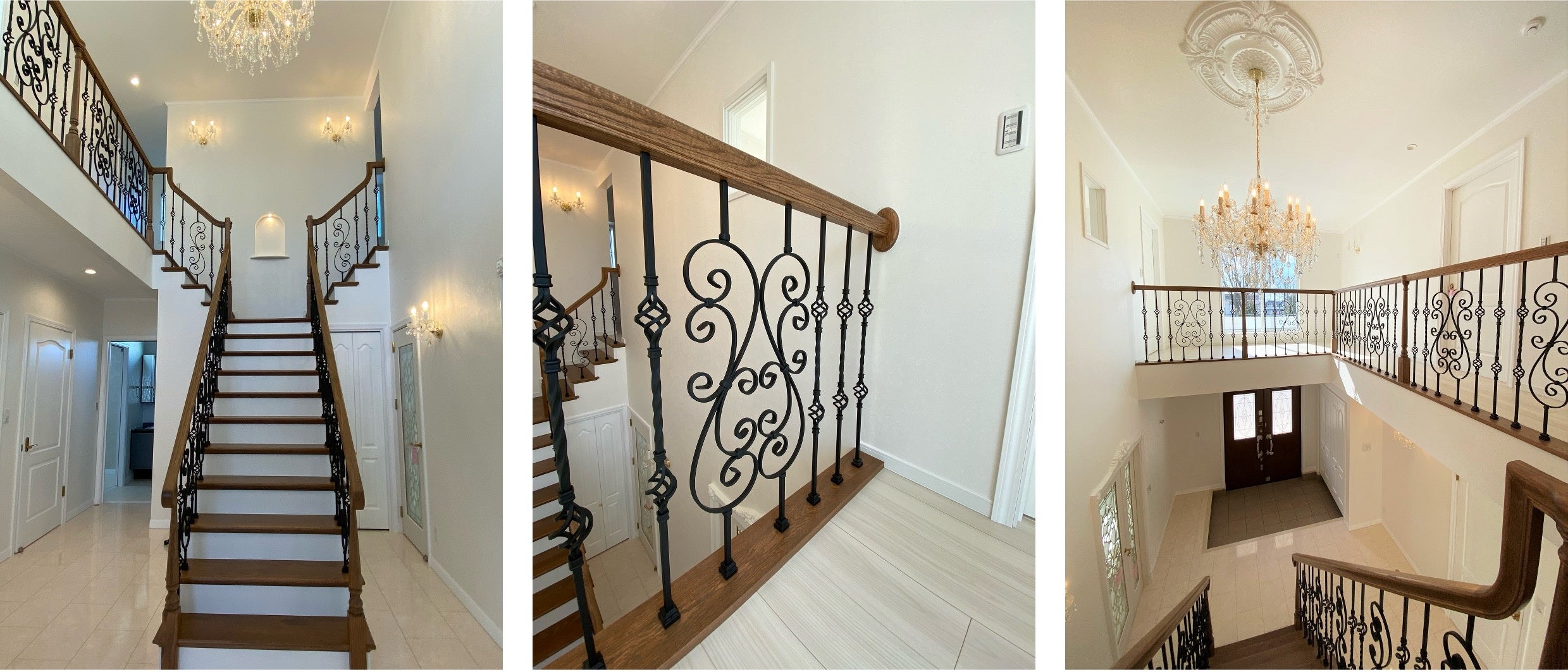 T字型の階段を採用することで、まるで宮殿のホールの様な豪華な玄関へ。アイアンバラスター手摺は向かい合わせに配置することでハート型が組み合わさったイメージのデザインにレイアウトしています。