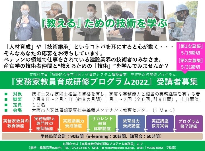 舞鶴工業高等専門学校(京都府舞鶴市 校長:内海康雄 以下「舞鶴高専」)社会基盤メンテナンス教育センターでは,建設業界のベテラン技術者の方々が”教える”ための技術を学ぶプログラムとして,「実務家教員育成研修プログラム」を開催しています。現在,2022年度受講者を募集しています。【応募締切:5月31日(火)メール必着】