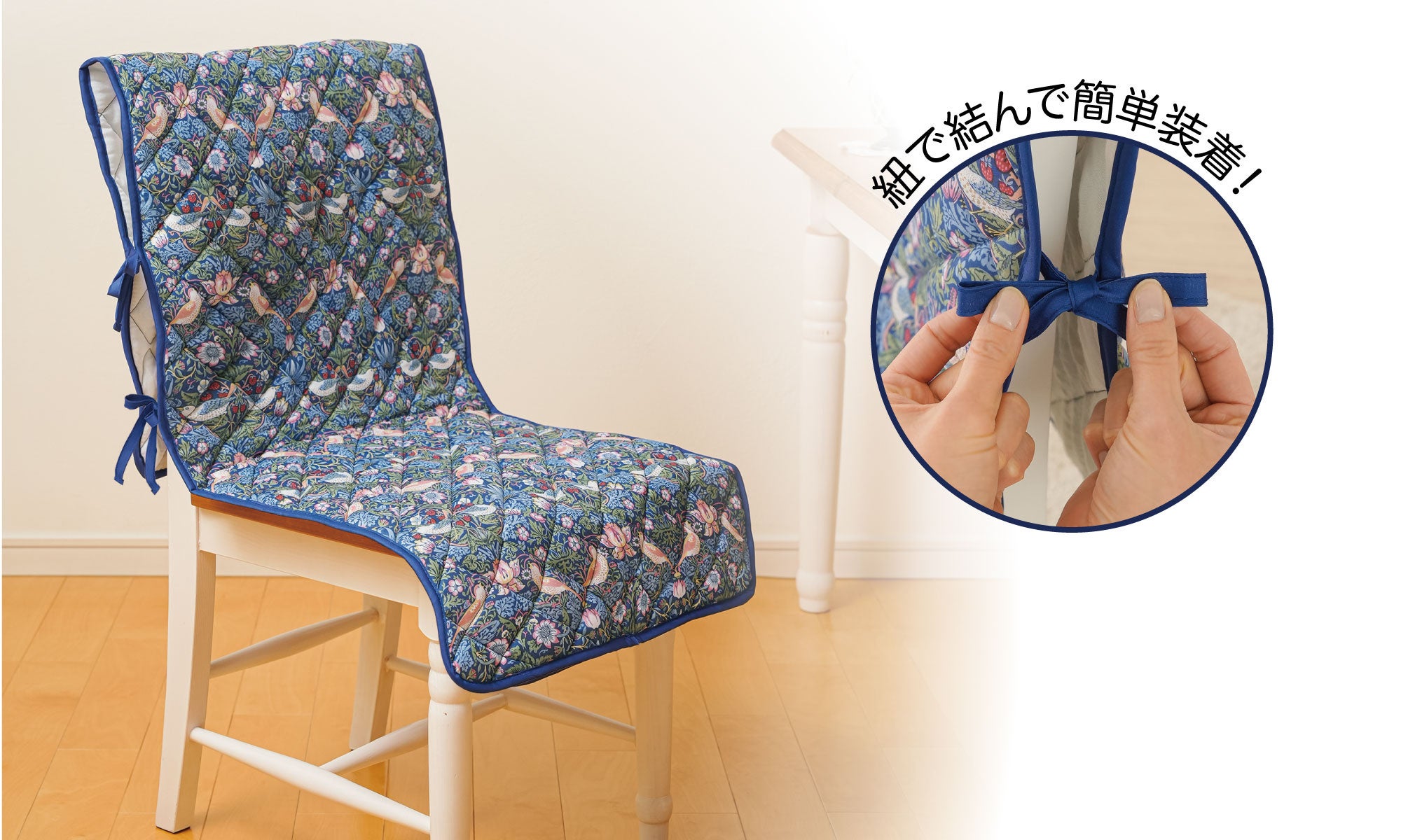 椅子の背もたれにサッと掛けて4箇所の紐を結ぶだけで簡単に取り付け。