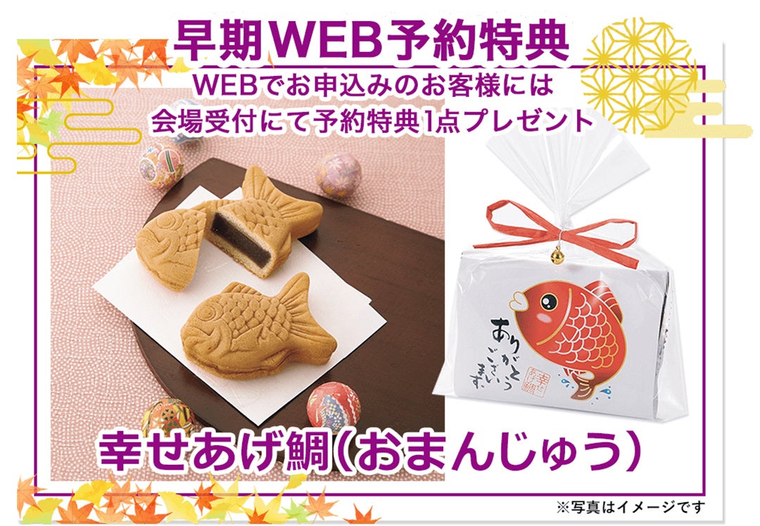 2024年9月5日(木)から9月8日(日)の4日間、開催場所は、東京都立産業貿易センター・台東館7階。早期WEB予約で「幸せあげ鯛(おまんじゅう)」をプレゼント!