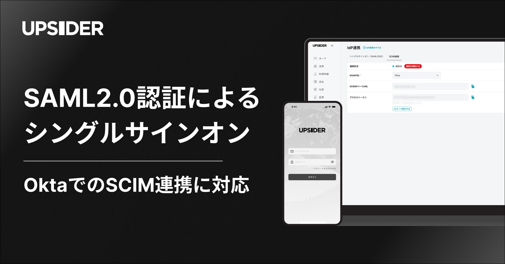 「挑戦者を支える世界的な金融プラットフォームを創る」をミッションに、法人カード「UPSIDER」(以下、UPSIDER)をはじめとする金融サービスを提供する株式会社UPSIDER(代表取締役:宮城徹・水野智規、本社:東京都港区、以下 当社)は、UPSIDERにおいて、SAML2.0認証によるシングルサインオン、およびOktaでのSCIM連携に対応いたしました。本機能は、すべてのUPSIDERユーザーに無料で提供いたします。