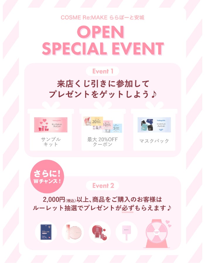 ご来店いただいたすべての方に、くじ引きに参加いただけます!韓国コスメのサンプルや全国の「COSME Re:MAKE」店舗で使えるお得なクーポンが当たります。