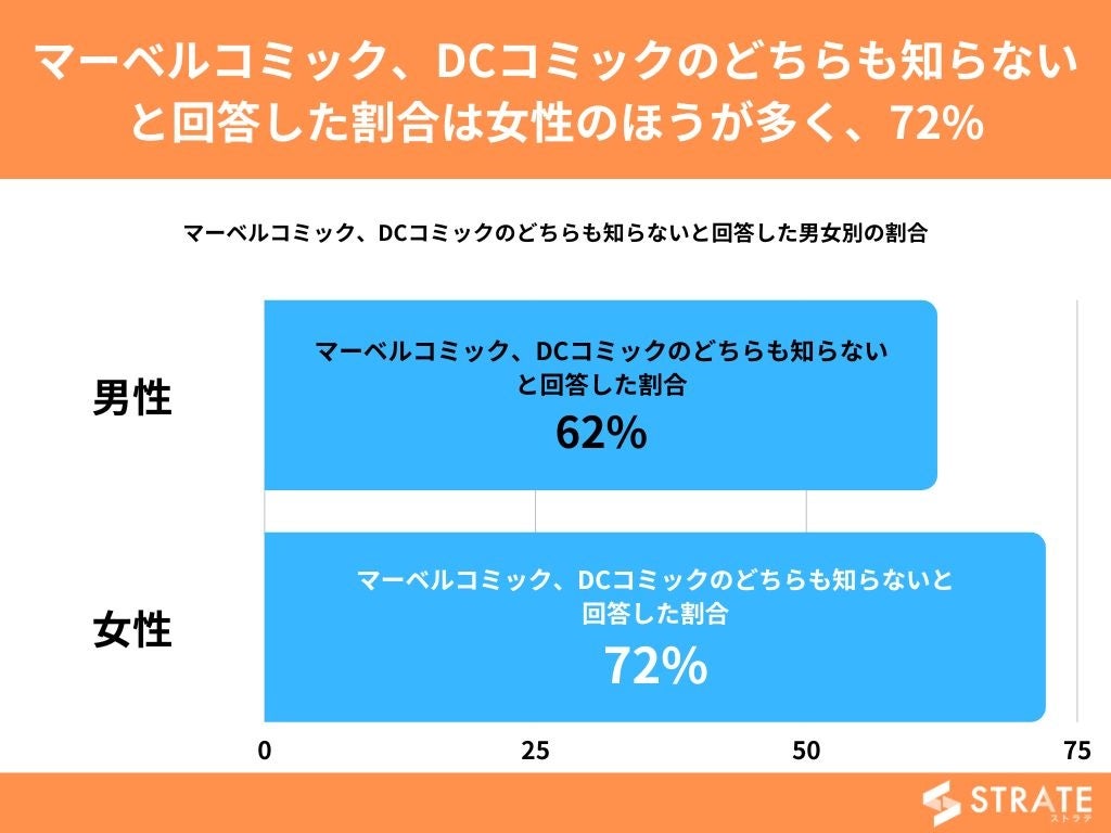 マーベルコミック、DCコミックのどちらも知らないと回答した割合を男女別にみてみますと、女性が72%、男性が62%という結果になりました。